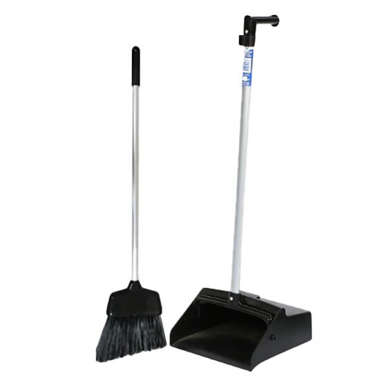 Commercial Lobby Pan Set. Industrial strength lobby pan and broom - both with Aluminium handles . Stiff angled bristles collect large particles and get into hard-to-reach areas for a thorough sweep