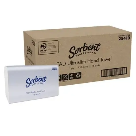 Sorbent Professional® TAD Ultraslim paper towel is super absorbent and ultra-strong wet or dry. Specially selected fibres within the paper towel are made to interlock, creating both greater strength and a sponge-like structure for maximum absorption. Sorbent Professional® TAD towels are an ideal and cost-effective solution for high traffic washroom areas.
