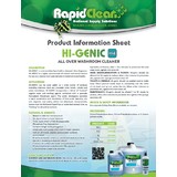 HI-GENIC is a blue liquid with a combination of safe acids, non ionic surfactants and a quaternary-based sanitiser. HI-GENIC is formulated on safe organic acids and non-ionic surfactants, a combination that has proven to be the least corrosive to all metal, yet gives excellent performance. This cleaner also has a pleasant cologne floral fragrance. Eco friendly Rapid Clean Green range.